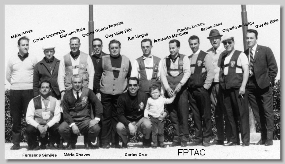CLUBE DE CAÇADORES DO PORTO Referente ao " XXIII PORTO - LISBOA" de 1965/06/12 Estes torneios eram realizados anualmente e alternadamente no Porto e em Lisboa entre o CLUBE DE CAÇADORES DO PORTO e o CLUBE PORTUGUÊS DE TIRO A CHUMBO EM CIMA DA ESQUERDA PARA A DIREITA: Guy Valle Flor, Carlos Cruz, Fernando Garcêz, Geifão Ferreira, Eng. João Janz, Alfredo Carmo, Cipriano Raio EM BAIXO DA ESQUERDA PARA A DIREITA: (?), Carlos Carmezim, Dr. Simões Lemos, Armando Marques, Luis Calheiros de Abreu, Francisco Ferreira